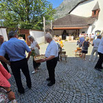 Verabschiedung von Monsignore Franz Josef Freericks, der die Urlaubsvertretung von Pfarrprovisor P. Evarist Shayo übernommen hat. Beim Platzkonzert der Bundesmusikkapelle Angerberg Mariastein am 20.08.2025 im Dreiklee übergab ihm Pfarrgemeinderatsobfrau MargrethOsl zum Dank einen Geschenkskorb. Heuer jährt sich sein Kommen zum 28. Mal. Vergelt's Gott!